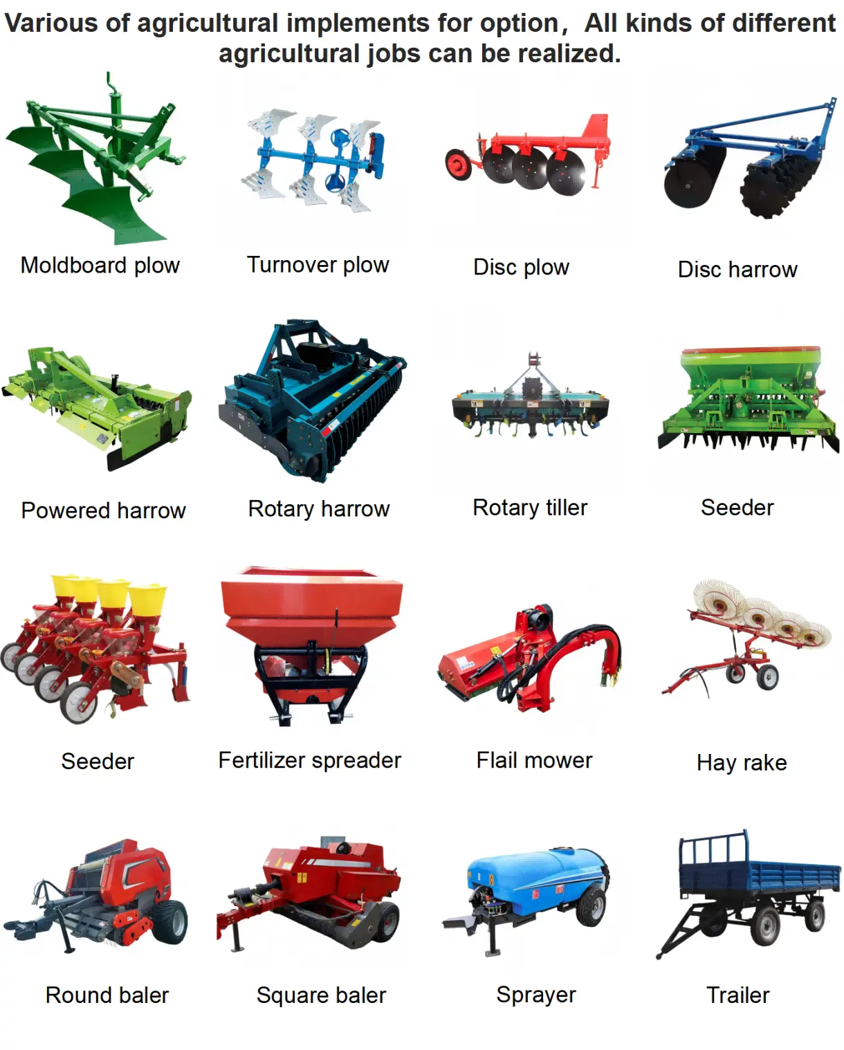 In hodiernis systematis productionis agriculturae, obtrectatores, sicut instrumentorum nucleorum potentiae, solum plenam suam potentiam consequi possunt cum scientificis et congruis adaptatis comitatus.agriculturae instrumenta. Copia instrumentorum agriculturae, quae ad ipsam productionem necessaria sunt, non solum significanter emendare efficientiam totius agriculturae, seminationis et administrationis agri, sed etiam industriam consumptionem et apparatum induendi et dilacerant minuere, unde fructus agricolae superiores creant.